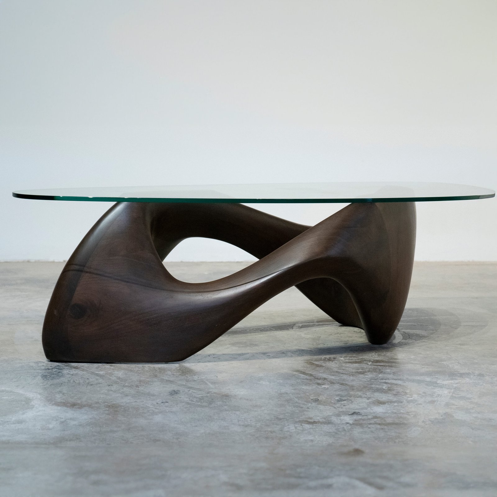 Each table is crafted from solid wood and shaped by hand to highlight smooth transitions and natural grain. The glass top enhances the sculptural quality of the base, allowing the curves to remain visible from every angle.