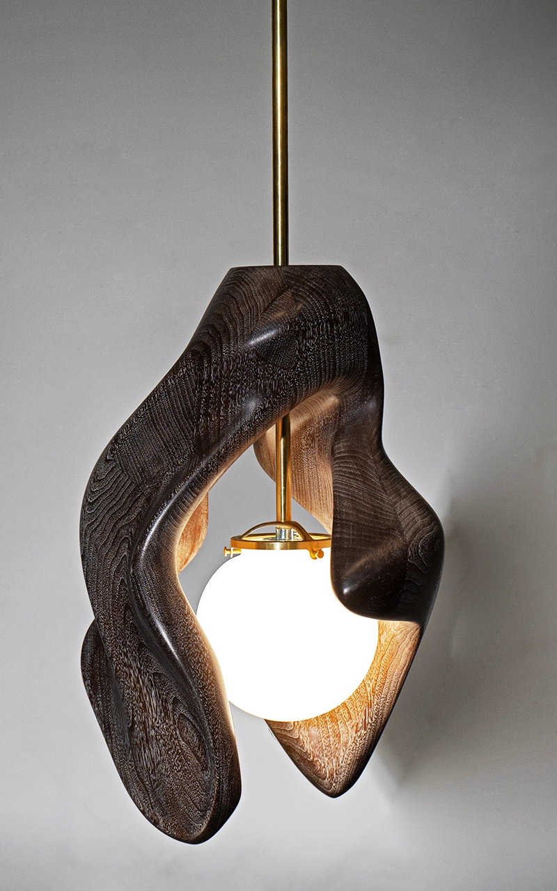 The Tulip Pendant Lighting merges fluid wood sculpture with soft ambient light. Its organic curves and glowing core evoke movement and warmth in any space.